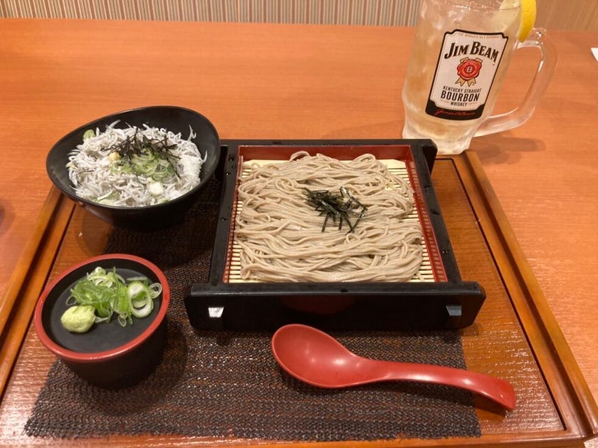 本日のサ飯はお蕎麦としらす丼とハイボールでございます。