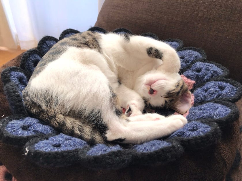 茶虎ちゃんの定位置がお正月に祖母から頂いた編み物の上になりました笑