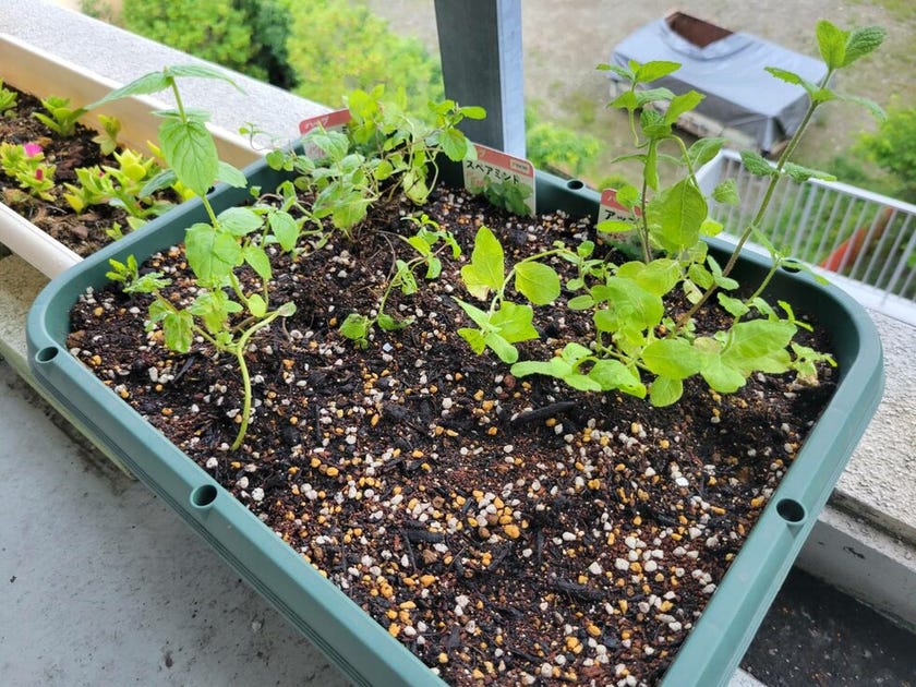 ミントは寄せ植えにしてもいいそうなので、4種類とも買ってまとめて植えています。