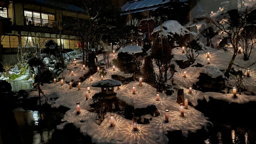 この旅館は冬季限定でお庭で雪見ろうそくを開催しており、雪にゆらゆらうつる炎をみながらゆっくりしました。